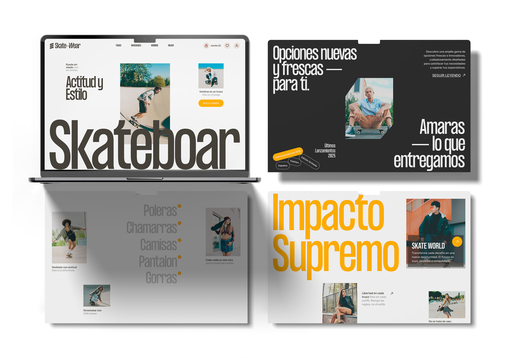 Skate Wear es una landing page minimalista enfocada en la moda urbana y el estilo skater. Su estética limpia en blanco y negro, acentuada con detalles en amarillo vibrante, refleja energía, frescura y modernidad. La tipografía contundente y los contrastes marcados transmiten autenticidad y carácter, mientras que el diseño ligero y directo ofrece una experiencia visual dinámica e intuitiva. Un proyecto que fusiona la esencia del skate con un enfoque de diseño contemporáneo y atrevido.